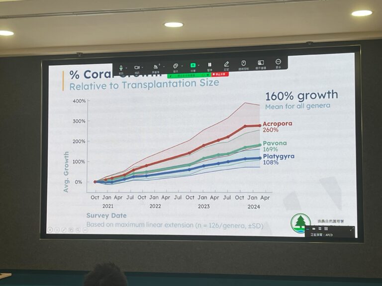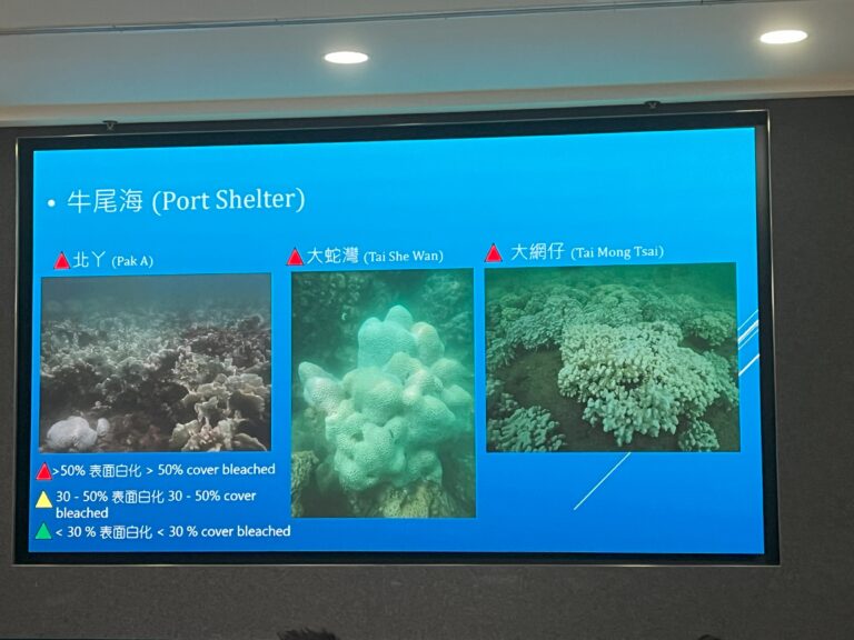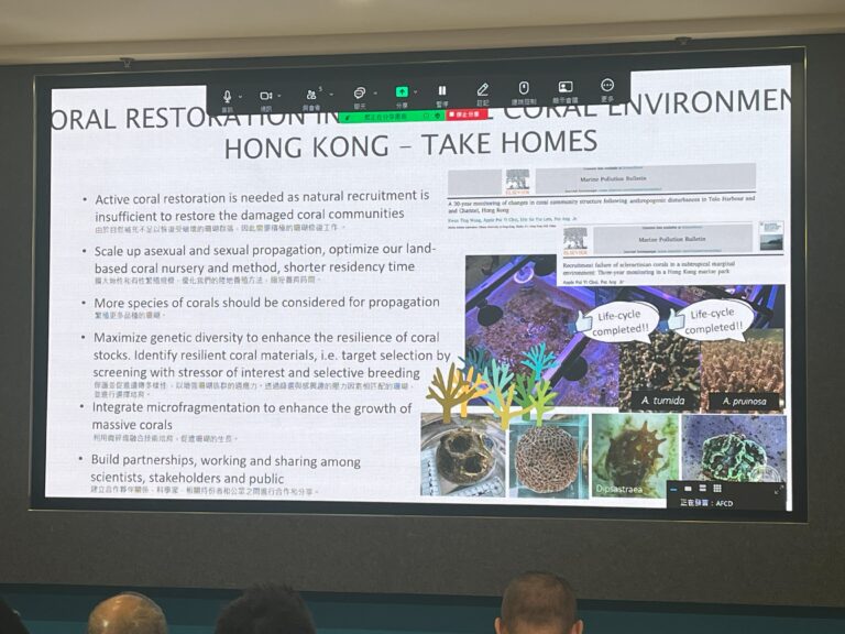 The symposium also heard from the Agriculture, Fisheries and Conservation Department of the Hong Kong government on the current situation of coral bleaching in Hong Kong, which highlighted the grave situation of coral in 2024, with bleaching events happening across all areas of Hong Kong. Coral bleaching occurs when waters are too warm, causing the corals to expel their symbiotic algae, and while , if the waters eventually cool, the coral can recover from this, it is also the first stage in the death of a coral.