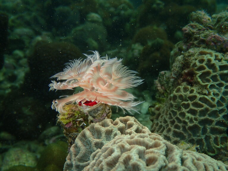 A delicate fan worm rests atop platygyra – a flagship coral species in Hong Kong.