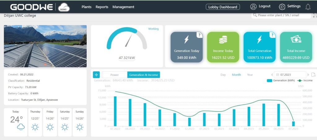 Armenia’s favourable climate, featuring an average of 270 to 300 sunny days per year, presents an ideal environment for solar energy utilization. The installation of solar panels at UWC Dilijan College capitalizes on this advantage, tapping into the abundant sunlight to generate clean and renewable electricity. In July of the previous year, the solar panels covered over 10% of the campus’s energy consumption, demonstrating their effectiveness.
